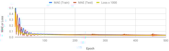 Figure 6 shows the MAE and loss values of RNN. The data are continuous time-series data of the movement of a drifter over time. Although the loss value is reduced above 100 epochs, the MAE of the training and test data did not decrease. We set the final epoch of RNN to 1000. LSTM was similar to RNN, but there were ups and downs on the MAE graph as learning progressed. The final epoch of the LSTM was set to 500. Figure 7 shows the MAE and loss values of LSTM.