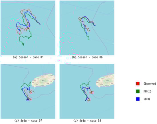 Figure 8 shows the trajectory of a drifter predicted by CMA-ES, which showed the best performance for Seosan. Figure 9 exhibits the trajectory of a drifter predicted by LSTM, which had the best performance for Jeju. Finally, Figure 10 presents the trajectory of a drifter predicted by RBFN with the best performance for MAE. Both ML and evolutionary search optimize the parameters. There is a slight difference in accuracy, but all of them predict similar paths.
