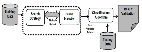 In the first phase, a candidate attribute subset is generated using an effective search algorithm. In the next phase, every subset is evaluated on the basis of a predefined evaluation condition and verified with the previous optimal subset. It is replaced with the previous subset if it is found to be a better subset. This subset generation and evaluation procedure continues until a termination factor is reached. Finally, the selected attribute subset is verified and validated with predetermined testing data samples. The overall process is illustrated in Figure 1.