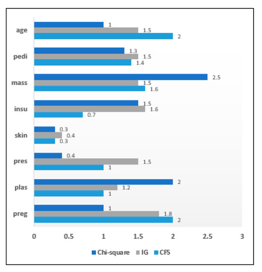 - Mishra, S.; Chaudhury, P.; Mishra, B.K.; Tripathy, H.K. An implementation of Feature ranking using Machine learning techniques for Diabetes disease prediction. In Proceedings of the Second International Conference on Information and Communication Technology for Competitive Strategies, Udaipur India, 4–5 March 2016; pp. 1–3. [Google Scholar]