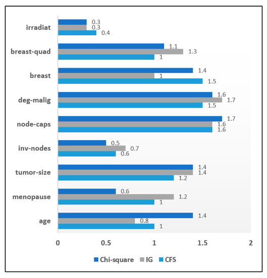 This subsection highlights the importance of the filter approach for chronic disease datasets. The filter approach was used to generate a reduced attribute set for different chronic disease datasets, where the attributes were the relevant symptoms. 270 heart disease dataset instances have been collected with 13 distinct attributes initially present. These samples were subjected to the filter approach. Individual attribute score can be seen from the attribute significance graph and as seen ‘ca’ and ‘Exang’ are the least relevant attributes according to the filter approach. Figure 6 highlights the attribute significance analysis concerning heart disease data. Figure 7 depicts the attribute significance graph of the Diabetes dataset that has a total 768 instances with 8 attributes. The attribute ‘skin’ generated a comparatively lower score of 0.3 with filter approach. Similarly, the filter approach was evaluated on a breast cancer dataset. The attribute significance graph is presented below. The significance score of the attribute ‘irradiat’ was the lowest, with only 0.3, in comparison to other attributes. It is highlighted in Figure 8.