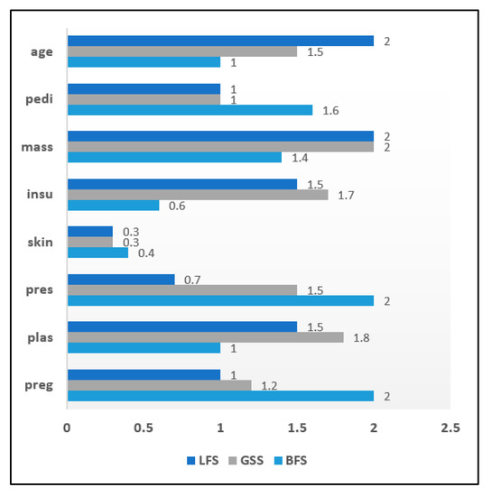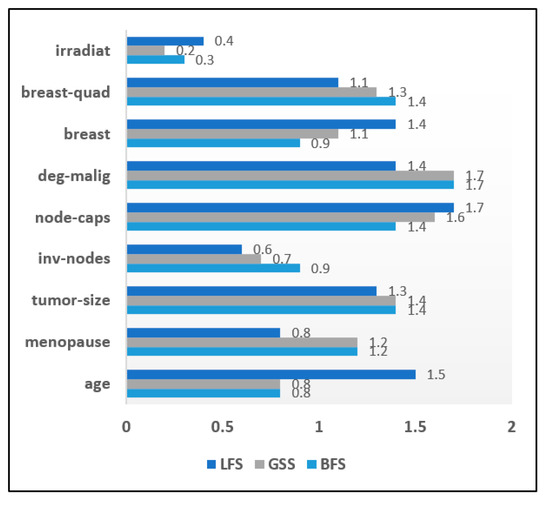 The reduced sets of attributes obtained by the BFS, LFS and GSS methods were identical, which constitutes 10 attributes while eliminating 03 irrelevant attributes. Wrapper methods were evaluated with the diabetes dataset to get an optimized attribute set. It has been observed that among eight attributes, only one attribute was identified as irrelevant. Consequently, it was eliminated from the resulting set in all three wrapper methods. The BFS and LFS methods obtained reduced sets of attributes for breast cancer data that contained eight attributes in total. The GSS method included only seven attributes in its reduced set. Table 10 depicts the tabular analysis of the reduced attribute sets after using the wrapper approach.