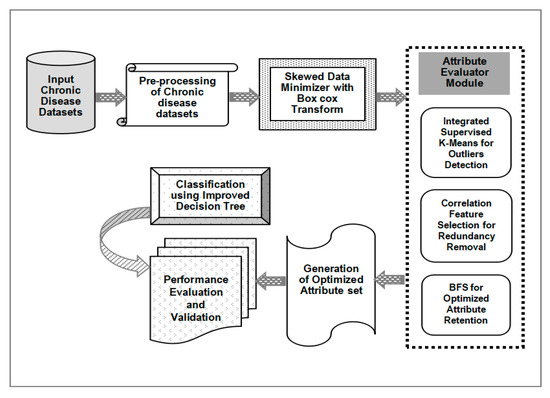 In this section, a new hybrid classification model for chronic disease datasets is presented. Figure 12 illustrates the proposed machine learning model using the integrated 3-step attribute evaluator method and an improved decision tree classifier. A chronic disease dataset collected from a suitable and reliable source is the input to the model. Many times, these raw datasets are in unstructured form and thus it needs to be filtered and pre-processed to get it in proper format. The pre-processing of chronic disease data samples is the next step. The data records are scanned and the presence of unintended delimiters, commas or any other symbols is identified and removed. Inconsistencies like missing values or repetitive instances are detected and are replaced with the mean value in the corresponding column. Once the dataset is made free from any ambiguity and thoroughly pre-processed, it is pushed into the skewed data minimizer. The pre-processed data samples are usually unbalanced and uneven. Due to this uneven distribution of data instances the data visualization does not follow a normal distribution thereby its classification performance gets hampered. In this model this skewed data is effectively handled by using box cox transformation. It is a transformation that transforms a random dependent features into normal forms. It enables the predictors to execute the datasets with a wide range of use cases. The core part of box cox transformation is an exponential value which ranges in between −5 to 5. values within the specified range are taken into consideration and its optimum value is chosen. The optimum value denotes the value that creates the best normal distribution curve. It can be represented as in Equation (1).