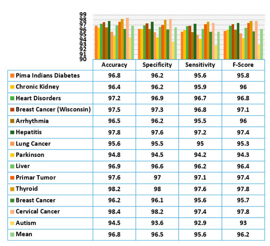 The heart disease dataset, as shown in Table 5, is implemented in this analysis. It consists of 270 instances with two different class labels to detect the presence and absence of heart disease in patients [79]. The data record contains 13 unique symptom attributes.