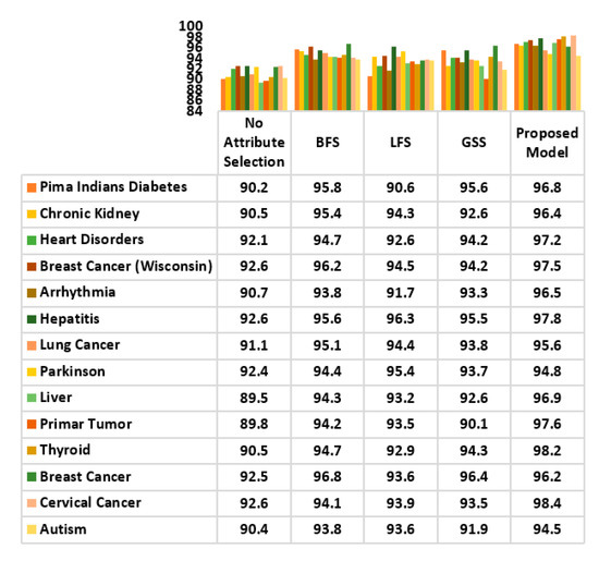 - Sushruta, M.; Hrudaya, K.T.; Brojo, K.M. Filter Based Attribute Optimization: A Performance Enhancement Technique for Healthcare Experts. Int. J. Control Theory Appl. 2017, 10, 295–310. [Google Scholar]