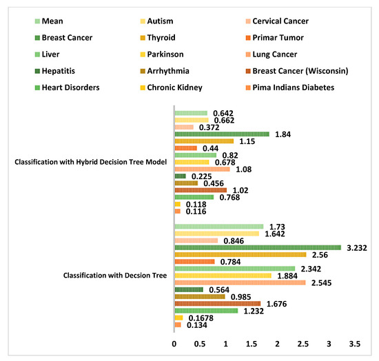 After determining the relevant score level of all attributes of the chronic disease datasets, the reduced and optimized attribute set is classified using the Decision Tree algorithm. The classification process has been conducted to detect the presence or absence of the chronic disorder in patients. The filter methods have been applied to classify the chronic disease datasets using the Decision Tree classifier; the obtained results are interesting. It was observed that the CFS method outperformed other filter methods concerning the accuracy rate and execution time. In this work, accuracy rate is selected as the heuristic function to rank attributes. CFS method performed better than others as it evaluates the attribute subsets which exhibit strong association with class label but least dependence on each other. Thus, weekly correlated attributes are less significant and thus dropped. With heart disease dataset, the CFS method achieved an accuracy of 93.8%. Furthermore, this method produces an 89.5% accuracy rate and only a 1.02 s delay in execution with the diabetes dataset. The CFS method also provided 96.8% accuracy and a minimum execution time delay of only 1.01 s when classified with breast cancer data. Table 9 presents a tabular view of classification accuracy and latency analysis using filter methods.