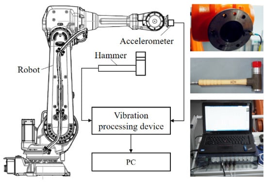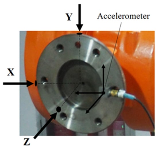 The sample configurations selected by CCD design vary greatly, for the convenience of implementing all the trials in the CCD design, hammer excitation is chosen, and a three-direction accelerometer is fixed on the flange of robot to acquire response signal. In this way, the extra mass brought by EMT device can be negligible as the accelerometer is small and light compared to the robot. Excitations are generated from three directions for each trial, which are corresponding to the three directions of the accelerometer, as shown in Figure 4. Then three FRFs will be obtained for natural frequency identification, avoiding incomplete excitation or excitation on the nodes. Moreover, for each direction, five groups of excitation and response signals are acquired to decrease the signal-to-noise ratio through average algorithm. With FRFs the natural frequencies are preliminarily identified, then complex modal indicating function is used to confirm the accurate values of natural frequencies.