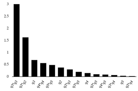 As mentioned, the general regression equation concludes q2, q3, q4, q5, and their cross items and square items. The general equation is marked as M. After the second principal component is extracted, validation indicates are shown in Table 2. The second principal component deduces , meaning that comprehensive ability is weakened. Though increases, the second principal component is still abandoned.