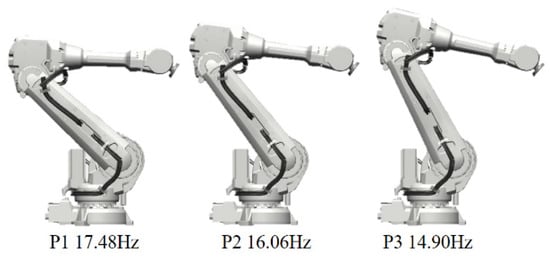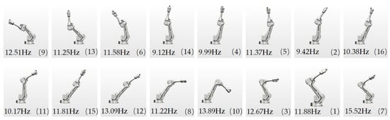 Sixteen groups of q2–q5 values are picked randomly from the variable range defined in Section 2.1.1, through which 16 corresponding robot configurations are defined for model verification. The simulation images of the 16 configurations are reranked by joint angles q2 and q3 as shown in Figure 7, and the measured natural frequency is listed in the bottom left corner of each image. The configurations are nearly uniformly distributed in the variable range, which ensures the comprehensiveness of verification objects and rationality of verification result.