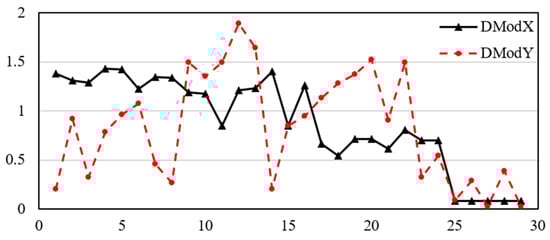 In PLS method, when model is constructed by principal components, information in the last residual matrix is ignored, causing the error between fitted model and original data. Standardized distance between sample point and model can be used to evaluate the construction quality. (DModX,N)i or (DModY,N)i is the ratio of construct quality of the ith sample point and the average construct quality. When the ratio is less than two, the construction for the ith sample point is reasonable. Construction quality of M2 is shown in Figure 8. (DModX,N)i and (DModY,N)i are all less than two, that means the construction of M2 is rational.