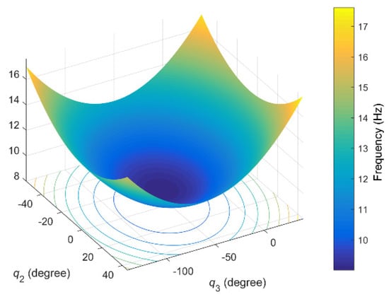 a2 and a3 control the two longest links, by which the basic configuration of robot is determined. Through VIP values, items involving q2 and q3 are demonstrated to act dominated role in prediction model. a4 and a5 decide the direction of robot flange, which affect the configuration less than a2 and a3. Taking M2 for an example, the influence of q2 and q3 on natural frequency is specifically studied and illustrated in Figure 11. When q2 = −55° and q3 = 40° (Pmax), the maximum first order natural frequency is obtained, and the minimum appears when q2 = −2° and q3 = −56° (Pmin).