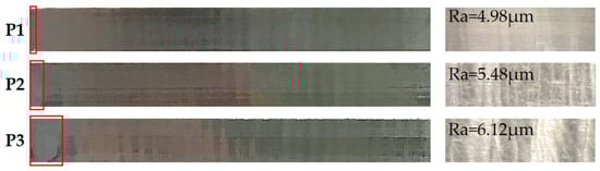 As for the milled surface, an obvious tool recession appears at P3, as shown in the red frame in Figure 15, while the situations are better in at P1 and P2. In addition, the quality of milled surfaces at P3 is the poorest compared with P1 and P2, and the vibration phenomenon on milled surface is getting severer from P1 to P3, indicating that configuration with higher first order frequency may lead to better milling performance, as mentioned in [20]. Whether there exits practical relevance between the value of natural frequency and machining performance can be a further research topic to develop more application of natural frequency prediction.