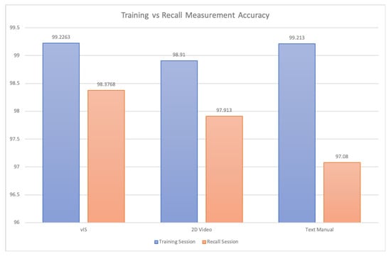 In combination with the measurement time observed during the recall phase, the significance of our storytelling system’s capability to provide long-term training can also be found by comparing the accuracy of measurements in training and recall sessions. As evident from Figure 3, although the accuracy reduced for all methods in the recall phase, the accuracy of measurements remained consistently higher for the vIS system compared to the traditional methods. A statistical difference of p < 0.05 proves that our immersive storytelling system performed extremely well regarding the long-term retention of training material.