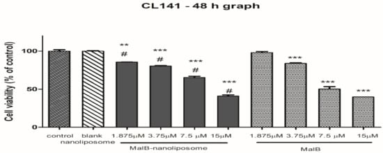 Cells were seeded in 96-well plates at a density of 2000 cells per well in triplicate for 24 h before sample exposure. Cells were then treated with different unloaded malB concentrations and corresponding malB-nanoliposomes of indicated treatments for 48 h. Cytotoxicity was assessed by using the sulforhodamine B (SRB) assay []. Briefly, the medium was discarded, and adherent cells were fixed by 100 μL/well of cold 10% trichloroacetic acid (w/v) for 1 h at 4 °C. After fixation, cells were stained with 0.4% SRB solution (w/v in 1% acetic acid) for 30 min at RT, and then washed twice with 1% acetic acid. After air-drying, 100 μL of 20 mM Tris-base were added to each well and the absorbance was measured at 540 nm. Cytotoxicity is expressed as the percent of cells relative to the number of cells in the solvent only as control (set to 100%). Each experiment was performed independently at least 3 times.