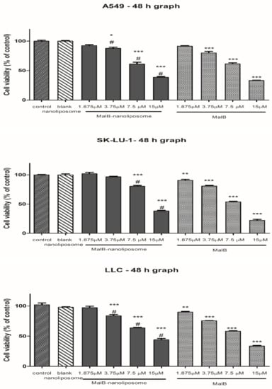 Cell viability after 48 h under the treatment of malB-nanoliposome C or free compound on different lung cancer cell lines. Cultured cells (2 × 103 cells/well) were treated with different concentrations of either malB-nanoliposomal or free malB. Normal saline served as the negative control. Each value represents the mean ± SEM. One-way ANOVA was used for analyzing statistical differences between groups. * p < 0.05, ** p < 0.01, *** p < 0.001 when compared with negative control. # p < 0.01 when compared with blank liposome.