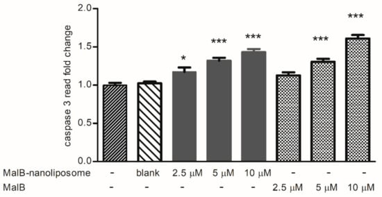 Caspase 3 is a typical enzyme related to the apoptosis of mammalian cells. To determine the apoptosis-inducing activity of malB and malB-liposomes, caspase 3 activity was measured under conditions of treatment with the free compound or its nanoliposomes using a caspase 3 colorimetric kit. As shown in Figure 4, malB and structure C malB-nanoliposomes significantly increased the changes in caspase 3 activity at doses of 10 µM and 5 µM in comparison with the control (p < 0.01 and p < 0.05, respectively). However, no significant differences in caspase 3 induction were observed between malB and malB-nanoliposomes.