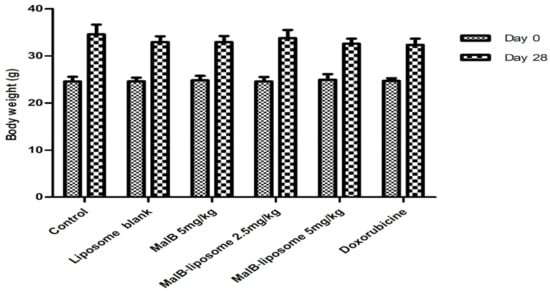 Effects of malB or malB-nanoliposomes on body weight of BALB/c mice harboring a malignant tumor induced by LLC cells (n = 6). Error bars represent standard error of the mean (SEM).