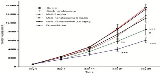 Anti-tumor effects of malB or malB-nanoliposomes on BALB/c mice harboring a malignant tumor induced by LLC cells (n = 6). Liposome-conjugated malB at the dose 5.0 mg/kg b.w. significantly inhibited tumor growth after 21 and 28 days compared with the negative control (normal saline treated) (** p < 0.01 and *** p < 0.005, respectively). # p < 0.05 compared to the free malB at the same dose. Error bars represent standard error of the mean (SEM).
