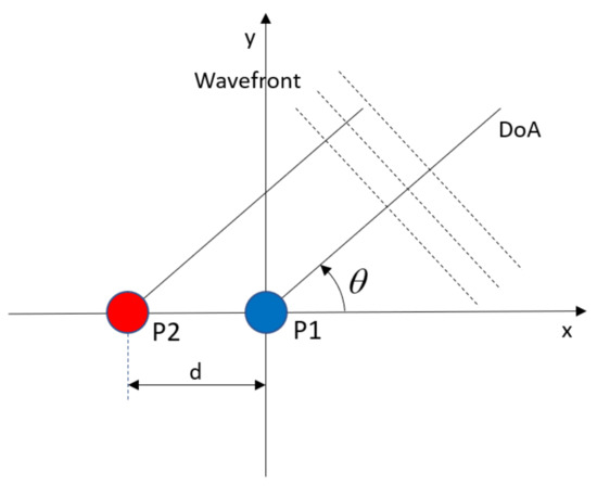 The simplest sensor configuration to perform the wave DoA estimation is based on a couple of isotropic transducers, i.e., the piezopatches P1 and P2 illustrated in Figure 1. Assuming a planar wavefront, the Difference in Time of Arrival (DToA, ) is related to the wave DoA () by this formula: