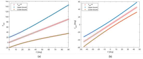 Figure 3b shows the upper and lower bounds of the conventional cluster with three circular sensors [9,10] with the MDDP equal to (this distance corresponds, for the circular sensors, to the physical distances between sensors in Figure 3a). The cluster of shaped sensors that implements the relations (3) and (4) with the parameters being detailed in Equation (6) allows for a theoretical average reduction of the worst case error of 11%. It is important to stress the fact that the comparison is provided with the same maximum absolute value for the DToAs (i.e., ). This means that the two clusters have the same memory requirements and same computational cost to estimate the time delays. It is also worth highlighting that the two clusters differ considerably in terms of DoA estimation function: the conventional cluster requires the evaluation of the atan function of the DToAs ratio, while the estimation function of the new cluster is simply linear w.r.t. the DToAs ratio. It is given by inverting (5) with respect to . Therefore it is compatible with embedded systems that are equipped with micro-controller units.