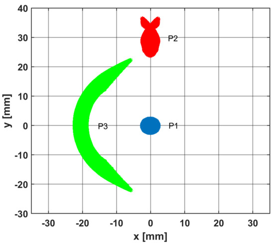 In conclusion, the synthesis procedure of the shape functions for sensors P2 and P3, which realizes the cluster of the desired re-shaped sensors, can be summarized, as follows: consider an isotropic circular reference sensor 1, then calculate its RT (constant over ) and impose the RT of sensors P2 and P3 by using (12) with and given by (6) (see Figure 4a,b). In particular, the shaped sensors cluster was designed with (the Maximum Difference in Distance of Propagation).