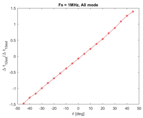 The ideal estimation function, linearly dependent with respect to the ratio , could be obtained by inverting (5) with respect to . However, due to binary quantization procedure, the actual values of parameters and might be slightly different with respect to the imposed ones (6). In Figure 6, it can be seen that, when a narrow-band Lamb wave mode (e.g., ) is simulated, the relationship between the DToA ratio and the DoA () is still linear. The parameters of the best-fit line, i.e., y-intercept m and slope q, can be computed by applying conventional linear regression procedures.