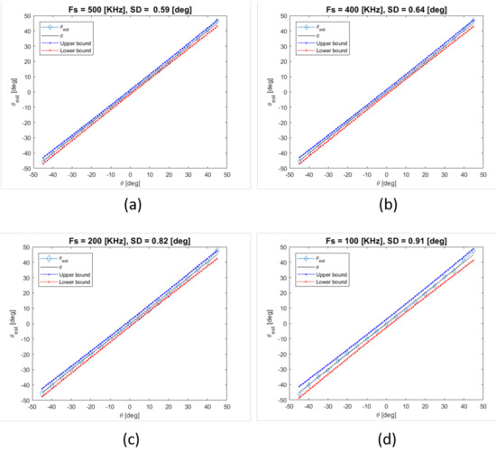 Estimated DoA () with respect to the actual DoA () at different sampling frequency values (indicated in the title of subplots, with the computed value of standard deviation of DoA) for the case of mode propagating (the upper and lower bound limits computed according to the Propagation of Uncertainty theory on the basis of the ideal sensors geometries).