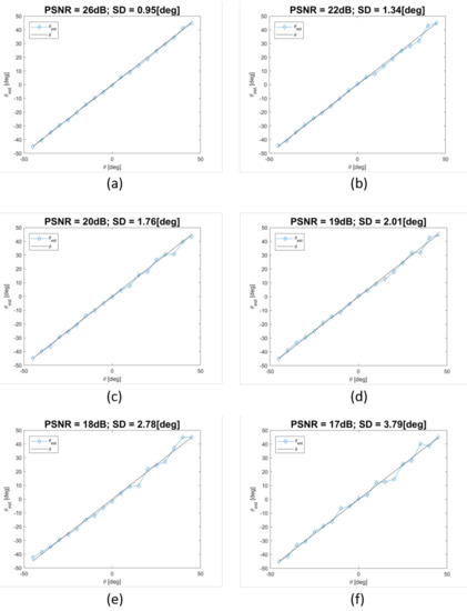 - In the Figure 8, to numerically assess the SD of DoA, 1000 simulations were performed with measurements being affected by AWGN with zero mean, for each value of PSNR.
