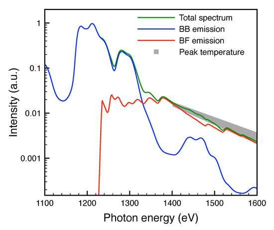 Figure 2 shows an example of the simulated time-and-space integrated spectrum for a photon energy of the XFEL of 1400 eV (green line). By separating the bound-bound and bound-free contributions from the spectrum (blue and red lines respectively), it can be seen that, in this case, the emission above 1400 eV is mostly produced by bound-free transitions. The intensity of the free-free emission in this region is several orders of magnitude lower, and therefore is not shown here. Given that the bound-free spectral emission has a characteristic energy dependence given by