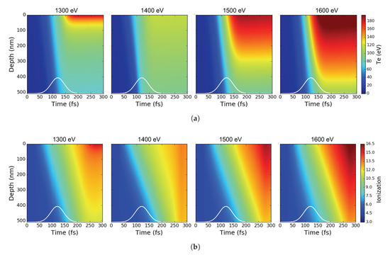Similar gradients appear in the mean charge () of the targets. For a photon energy of 1400 eV, after the XFEL beam has left the target (around t = 250 fs), the ionisation is roughly constant across the depth of the plasma, and the mean charge equals 12–13. However, for the other photon energies under consideration, the hot region at the front of the target gets ionised further (), whereas the back of the target remains at lower ionisation levels. This is most noticeable for a XFEL photon energy of 1300 eV, where the front of the target is S-like (), while the back of the target is Sc-like ().