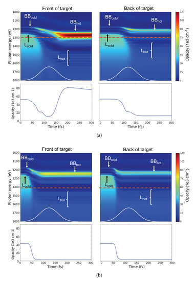 Figure 4b) as a function of time and photon energy, for the peak intensity of the laser. In this case, the front refers to the laser-irradiated surface of the target, and the laser pulse is indicated in white in all cases. Additionally, the photon energy of the XFEL is indicated as a dashed orange line. Each of the inset plots below the figures shows a more detailed lineout of the time evolution of the plasma opacity at the photon energy of the XFEL.