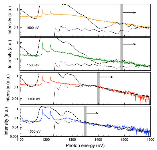 Figure 6, where the spectra from different shots with a XFEL photon energy of 1400 eV are shown together as a function of the pulse energy together with the average spectrum. These intensity variations arise from differences in the temperature of the emitting region of the plasma, as indicated by Equation (