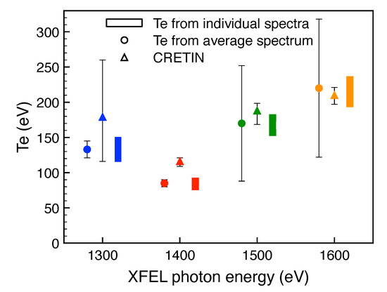 Figure 7, we show the comparison between the experimentally obtained temperatures and the peak temperatures predicted by the simulations for the four photon energies of consideration. The triangles represent the peak temperature predicted by Cretin, with the error bars corresponding to variations in this peak temperature with the change of the laser energy. The circles correspond to the temperature obtained from fitting the average spectra for each photon energy, with the error bars corresponding to the standard deviation of the fit parameters. The colored rectangles represent the range of temperatures obtained from individual shots by comparing their absolute spectral bound-free intensity with that of the average spectrum (shown in