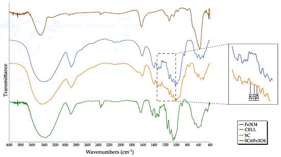 Fourier transform infrared (FTIR) spectra comparison between Fe3O4 IONs, cellulose (CELL), sulfonated cellulose (SC), and magnetic composite (SC@Fe3O4).