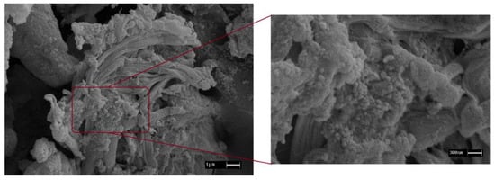 As can be observed, the SC@Fe3O4 composite presented some frayed regions (Figure 3C,D) not present in CELL@Fe3O4 (Figure 3A,B). The increasing of the number of amorphous regions can be attributed to the chemical functionalization of the polysaccharide, which disrupted the hydrogen bonds and exposed the fibers inside the microcrystals. It also increased the contact surface available for the aggregation of the magnetite nanoparticles, which were found inside the structure of the sulfonated microcrystals (Figure 4).
