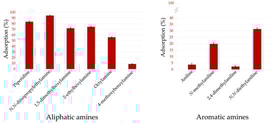Nonetheless, the hard–soft acid–base theory (HSAB) helps us explain the differences for the recovery percentages obtained for the aliphatic and aromatic species. In particular, the sulfate group exhibits a borderline behavior [,], while aliphatic ammonium ions are harder than the aromatic ones. Subsequently, the latter have a minor interaction with sulfate groups, providing a lower adsorption than aliphatic cations. In fact, the presence of one or two aliphatic substituents with the aromatic one on amine group, such as for N-methylaniline and N,N-dimethylaniline, partially reduces the effect due to the aromatic ring, while not increasing the adsorption up to levels of the aliphatic amines.