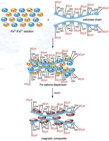 The preparation of magnetite-decorated sulfate cellulose nanoparticles (MDSCNs), obtained by the coagulation of an aqueous suspension of sulfate cellulose containing a Fe2+/Fe3+ solution through the subsequent addition of aqueous NaOH, is shown in Scheme 2.