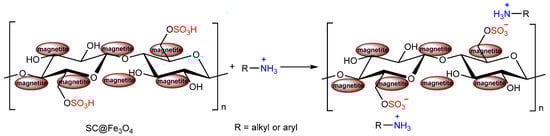 Considering our purpose to realize an alternative route for the removal of aromatic and aliphatic amines from water using an eco-compatible and easily removable magnetic composite material, we started from the functionalization of microcrystalline cellulose (MCC), using chlorosulfonic acid (ClSO3H) to introduce sulfates on the superficial hydroxide groups (Scheme 1).