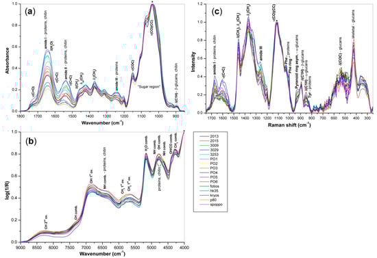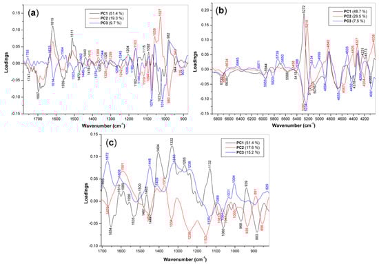 The PCA loadings of first three PCs for the FT MIR, FT NIR and FT Raman methods are represented in Figure 2; the band assignment is summarized in Table 5. In the case of FT MIR (Figure 2a), PC1 and PC2 showed two similar intense negative-to-positive couplets at 1697–1619 cm−1 and 1559–1511 cm−1 and a negative peak at 1246–1242 cm−1 corresponding to the amide I, amide II and amide III vibrations, respectively [40,41]. By contrast, PC3 showed two negative-to-positive couplets in this region at 1633–1614 cm−1 and 1564–1503 cm−1. These PCs also showed several intense peaks in the region of carbohydrate vibrations of 1204–943 cm−1, so they are sensitive to the amount and composition of polysaccharides [34].