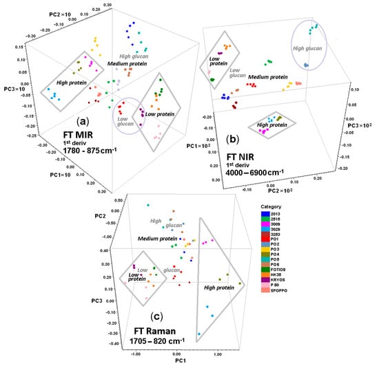 The 3D component score graphs of PC1 versus PC2 versus PC3 for the 1st derivations of FT MIR spectra (1780–875 cm−1), 1st derivations of FT NIR spectra (6900–4000 cm−1) and normalized FT Raman spectra (1705–825 cm−1) are represented in Figure 3. These graphs illustrate discrimination of the basidiocarp samples originating from sixteen P. ostreatus strains. The samples were assigned according to the amount of proteins and glucans, i.e., with low, medium and high contents of these components. It is evident from all these graphs that the samples po4, 3009 and 3029 with high protein contents (~16.6–17.5%) as well as kryos, hk35, p80 and fotios with low protein contents (~6.2–8.5%) were more or less separated from the rest. Samples spoppo and po3, which contained ~14.8 and ~13.9% proteins, respectively, were located in close proximity to the clusters of high- and medium-protein samples. Unfortunately, there was no discrimination of the basidiocarp samples based on the content of total glucans, although in some cases it was possible to localize samples with a high content (po5 and po2) or, on the contrary, a low content (kryos and po1) of these polysaccharides.
