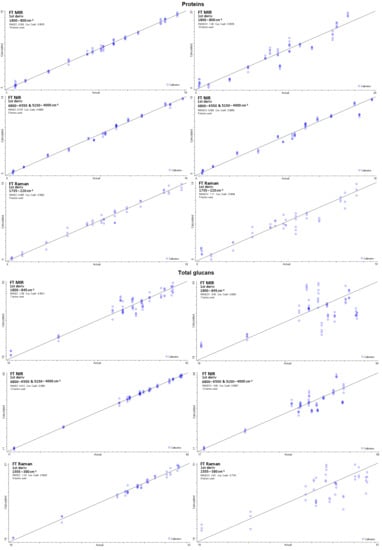 Among the vibration spectroscopic methods used, the FT NIR regression models for both protein and total glucans gave the best calibration and cross-validation parameters. Unfortunately, in all cases, the cross-validation of PLSR models for total glucans showed worse results than for proteins, and no suitable RMSE models separately for α- and β-glucans were obtained at all. Indeed, for proteins, the cross-validation parameters R2cv and RMSEcal were in the range of 0.901–0.970 and 0.608–1.11, respectively. These values are acceptable for PLSR models. By contrast, the corresponding values for total glucans significantly differed and were in the range of 0.370–0.804 and 4.66–8.50.