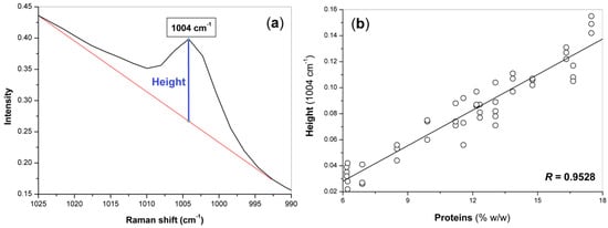 Using the Raman band of the Phe ring breathing vibration at 1004 cm−1 for determination of proteins in P. ostreatus basidiocarps: (a) measuring of the height; (b) correlation between this height and protein content (% w/w).