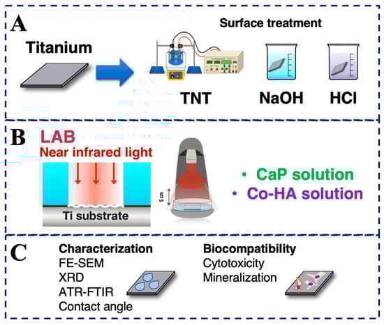 Compendium illustration showing the experimental procedures. (A) Surface treatment of titanium. (B) Preparation of laser-assisted biomimetic (LAB). (C) Characterization and biocompatibility of samples.