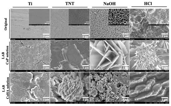 After the CaP solution was treated with LAB, CaP crystals were found on the surface. In addition, it was found that holes of different sizes affected the crystal shape and size (Figure 2). In pure titanium and alkali-treated test pieces, flake-like CaP crystals were observed, which was similar to the results of He et al. []. CaP crystals treated with the same alkalinity were smaller than those of pure titanium, which may have been caused by the influence of nanopores on the surface of the test piece. CaP observed on the surface after anodization showed a plate-like crystal structure. CaP formed on the surface after acid treatment presented a flower-like crystal structure composed of needle-like crystals. The morphology of HA with different crystal structures is consistent with that reported by Sadat-Shojai et al. []. LAB treatment of titanium flakes soaked in a CoHA solution showed different CoHA crystals (Figure 2). No crystals were observed on the untreated titanium piece. After anodic oxidation, it was observed that CoHA in the form of plate-like aggregates was consistent with the CaP synthesized by a hydrothermal method []. Surfaces treated with NaOH and those with HCl respectively exhibited flaky and plate-like crystal structures.