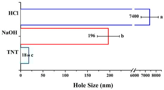 The holes size of the titanium sheet after different surface treatments. Means with different letters were significantly different (p < 0.05, mean ± SD, n = 10).