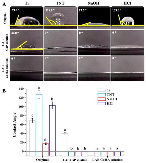 The surface wettability titanium sheet has different surface treatments. (A) Image of surface contact angle. (B) Quantitative analysis of the contact angle was performed. Means with different letters were significantly different (p < 0.05, mean ± SD, n = 3).