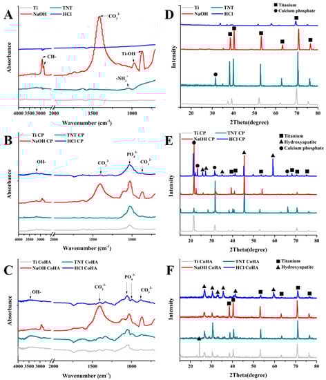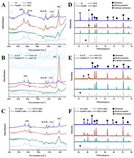 The characteristics of the titanium sheet with different surface treatments and samples after LAB treatments. (A–C) FTIR spectra obtained from original, LAB CaP solution and LAB CoHA solution. (D–F) XRD patterns of the original, LAB CaP solution, and LAB CoHA solution.