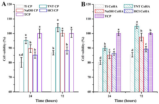 Proliferation determined according to 3-(4,5-dimethylthiazol-2-yl)-2,5-diphenyltetrazolium bromide (MTT) assay of MG63 cell for 24 and 72 h. (A) LAB CaP solution. (B) LAB CoHA solution. Means with different letters were significantly different (p < 0.05, mean ± SD, n = 4).