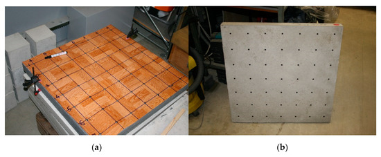 All slabs were measured using the ultrasonic testing method. The ultrasonic wave transit time [µs] was measured. Before the measurement itself was conducted, it was necessary to line the testing slabs on both sides with the measuring network and to mark the starting point of the measurement. Figure 2a shows the template for plotting testing slab and Figure 2b shows plotted slabs before ultrasound measurement.