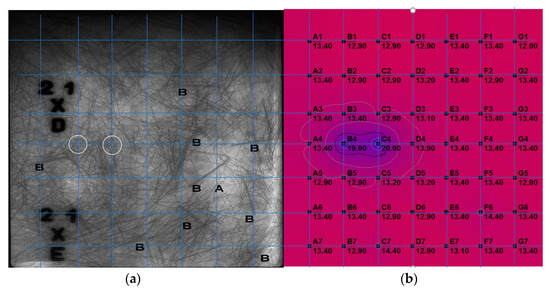 Comparison of radiography results and the ultrasonic testing method for Slab A2-1. (a) The marked points with A show a place with a locally lower density of steel fibers, and at the same time, the places marked with the letters B show the bundles of fibers that have remained connected; (b) the isovels shows ultrasonic wave transit time [µs]. The blue color of the isovels around points B4 and C4 shows almost twice the times of ultrasound passing through the material.